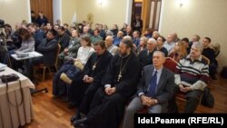 Неожиданное соседство ждало собравшихся в конференц-зале отеля Шаляпин: батюшки, люди с крестного хода и митинга, посвященного Дню народного единства, мусульмане, представители ДУМ РТ. А через несколько минут за одним столом окажутся Дамир Исхаков, историк и сооснователь Всемирного конгресса татар, Михаил Щеглов, лидер Общества русской культуры, и Раис Сулейманов из Института национальной стратегии, в качества модератора. "Idel.Реалии" о том, как почти три часа шесть десятков человек обсуждали место татар в "русском" и "российском мирах".