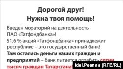"Дорогой друг! Нужная твоя помощь! Введен мораторий на деятельность ПАО "Татфондбанка"! 51,6% акций Татфондбанка принадлежит республике — это государственный банк! Там остались деньги наших граждан и предприятий — банк пытается ограбить сотни тысяч граждан Татарстана! Мы не согласны с этим, банк должны спасти люди власти! Мы их избирали, мы им доверяли, и забота о своих людях — их работа и ответственность!" — говорится в тексте листовки.