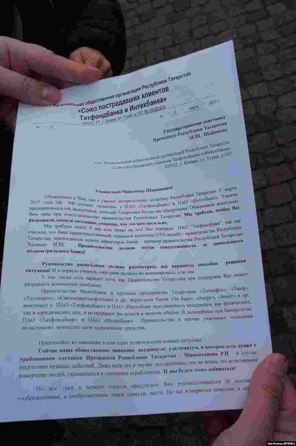6 марта обманутые вкладчики рухнувших татарстанских банков попытались встретиться с государственным советником Татарстана Минтимером Шаймиевым, но к ним вышел заместитель руководителя Аппарата президента РТ, руководитель секретариата Минтимера Шаймиева Олег Глебов. Передав ему свои требования, пострадавшие клиенты двинулись в Торгово-промышленную палату, где уже шла встреча вкладчиков с премьер-министром РТ Ильдаром Халиковым. Здание ТПП было оцеплено и кроме уже попавших внутрь никого не пускали.
