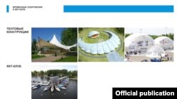 Но, вглядевшись внимательно в эти "картинки", вы увидите мосты на железобетонных сваях с железобетонными перекрытиями, дорожную развязку и асфальтированную дорогу, парковки на 500-1000 машин, плиточные терренкуры, рыбацкие домики, причалы и дебаркадеры, плавучие кафе и рестораны, кемпинги и яхт-клубы, и даже воздушные шары!