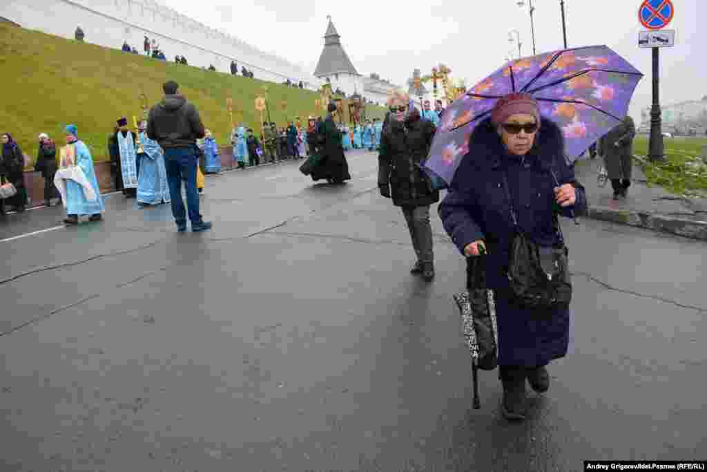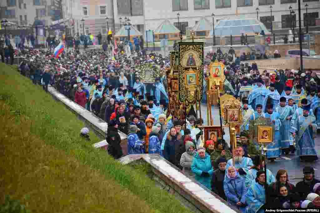 Главное богослужение в честь праздника состоялось утром в Благовещенском соборе Казанского Кремля. Оттуда участники крестного хода двинулись традиционным уже маршрутом вокруг Кремля, чтобы завершить шествие в Крестовоздвиженском соборе — считается, что в месте, на котором стоит храм, и была обретена в 1579 году Казанская икона Божьей матери.