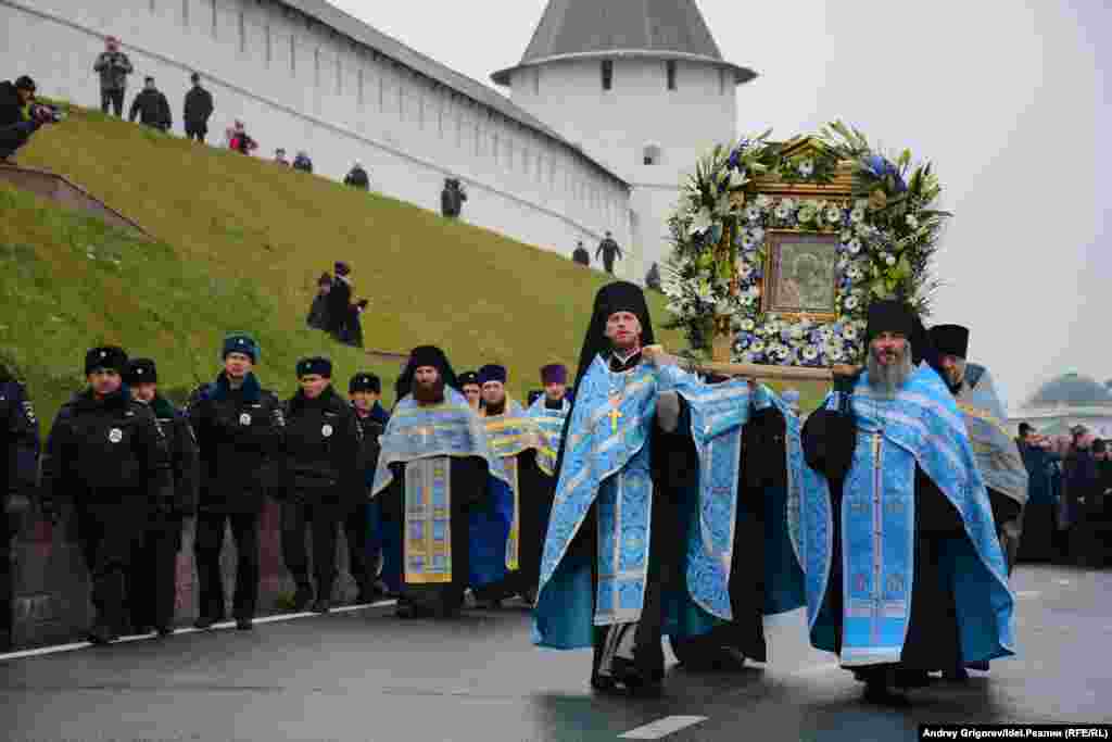 Главное богослужение в честь праздника состоялось утром в Благовещенском соборе Казанского Кремля. Оттуда участники крестного хода двинулись традиционным уже маршрутом вокруг Кремля, чтобы завершить шествие в Крестовоздвиженском соборе — считается, что в месте, на котором стоит храм, и была обретена в 1579 году Казанская икона Божьей матери.
