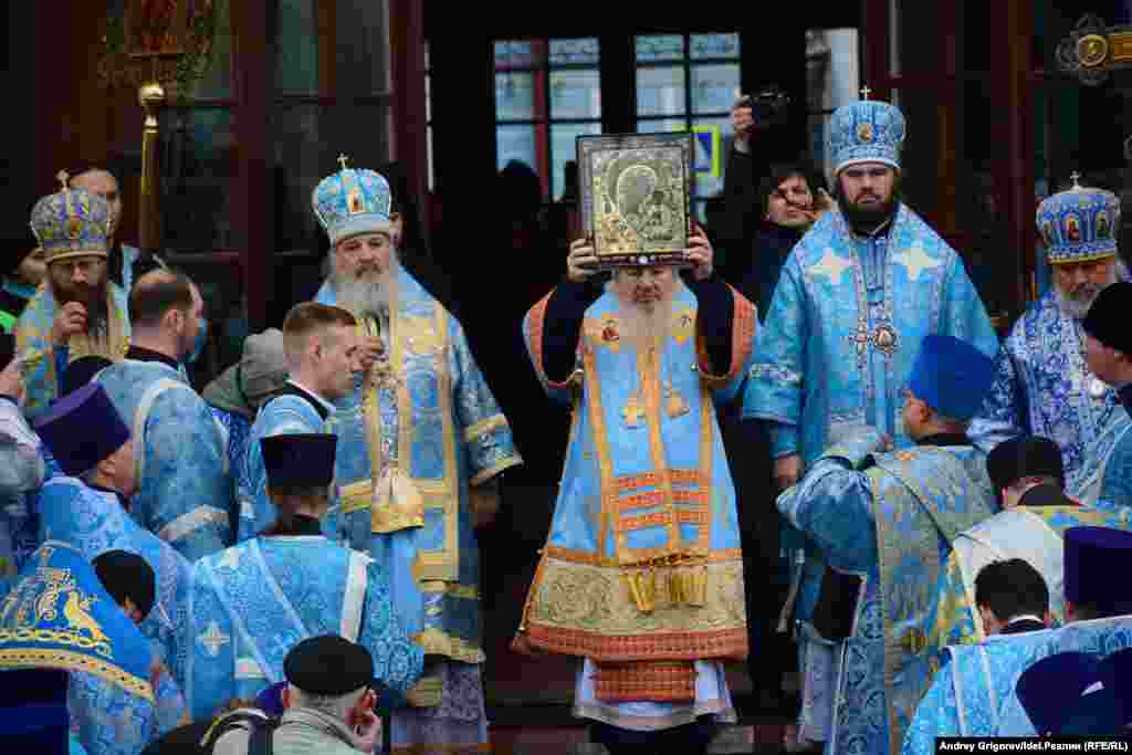 Главное богослужение в честь праздника состоялось утром в Благовещенском соборе Казанского Кремля. Оттуда участники крестного хода двинулись традиционным уже маршрутом вокруг Кремля, чтобы завершить шествие в Крестовоздвиженском соборе — считается, что в месте, на котором стоит храм, и была обретена в 1579 году Казанская икона Божьей матери.