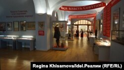 Когда входишь в помещение Национального музея, отведенное под выставку "Стихия революции: 1917 год в истории России", сразу замечаешь "перекос" — вся экспозиция оформлена в красных тонах, повсюду на стенах демократические, социалистические и советские лозунги. Замечая это, спрашиваем у нашего собеседника, есть ли у них что-то о либералах, о белом движении, о татарском национальном движении. Выясняется, что есть небольшой "татарский уголок", немного по революции 1905 года, несколько экспонатов посвящено белой эмиграции, а также попытке основания штата Идель-Урал.
