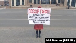 Сегодня в ее поддержку прошел одиночный пикет у здания Кабмина республики. Другая участница программы социальной ипотеки вышла с плакатом: "Позор ГЖФ!!! Отбирает у многодетной мамы квартиру за требование сдать дом 11-5".
