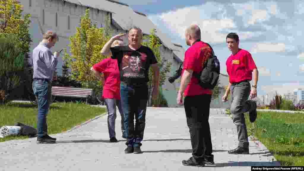 Группа комросов расположилась в стороне от лестницы, ведущей к ЦИК. Большинство собравшихся были одеты в одинаковые красного цвета футболки с логотипом партии. И только на первом секретаре комитета татарстанского республиканского отделения Альфреде Валиеве красовалась чёрная футболка с портретом Иосифа Сталина.