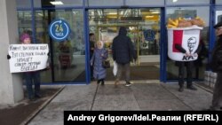 "Треснул пол, стеллаж упал и клиента ушатал" — один из комросов разворачивает плакат с таким стишком прямо у входа в гипермаркет. Из толп покупателей останавливаются и вчитываются единицы. Еще меньше тех, кто подходит и задаёт вопросы. Плакат со стишком не единственный, пикетчики сменяют друг друга, меняются и лозунги. "Лента может быть опасна для вашего здоровья", сообщается еще в одном. "Клиент, ты сюда не ходи! Тут стеллаж башка упадёт совсем мертвый будешь", - предупреждает третий плакат. Напротив него надолго замирает женщина, вышедшая из супермаркета с туго набитым пакетом.
