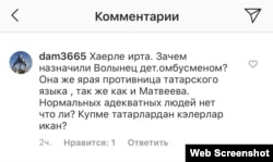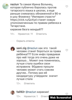 В Instagram-аккаунте президента Татарстана Рустама Минниханова пользователи также просят не утверждать кандидатуру Волынец на должность детского омбудсмена.