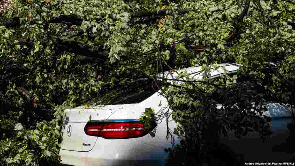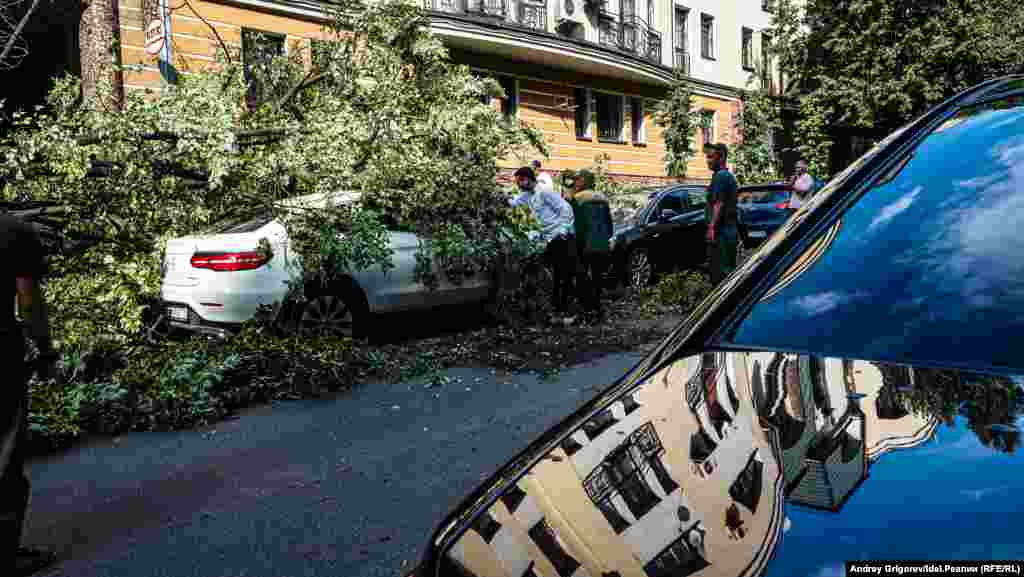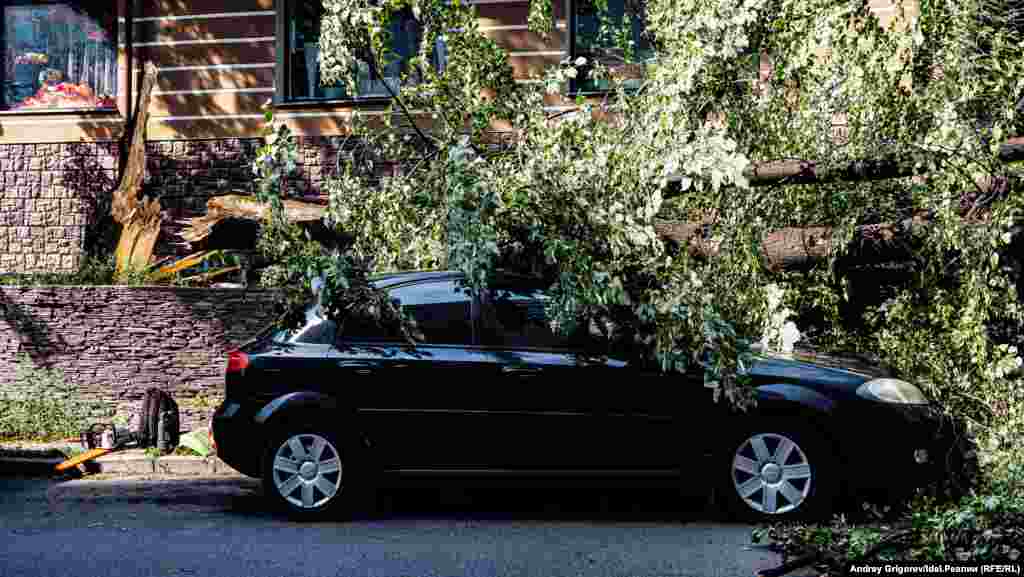 Свидетелем разбора завалов на фешенебельной улице Бассейная, спускающейся от Малой Красной к Пушкина мимо Верховного суда Татарстана, стал корреспондент "Idel.Реалии". Здесь дерево рухнуло сразу на несколько припаркованных у тротуара машин.