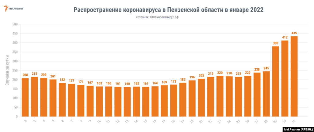 Самый большой рост суточных заражений за месяц показала Удмуртия. Если в начале января было 52 случая за сутки, в конце января — уже 1351. Рост в 26 раз. Следом идут Чувашия (рост в 13,2 раза) и Оренбургская область (в 10,2 раза).