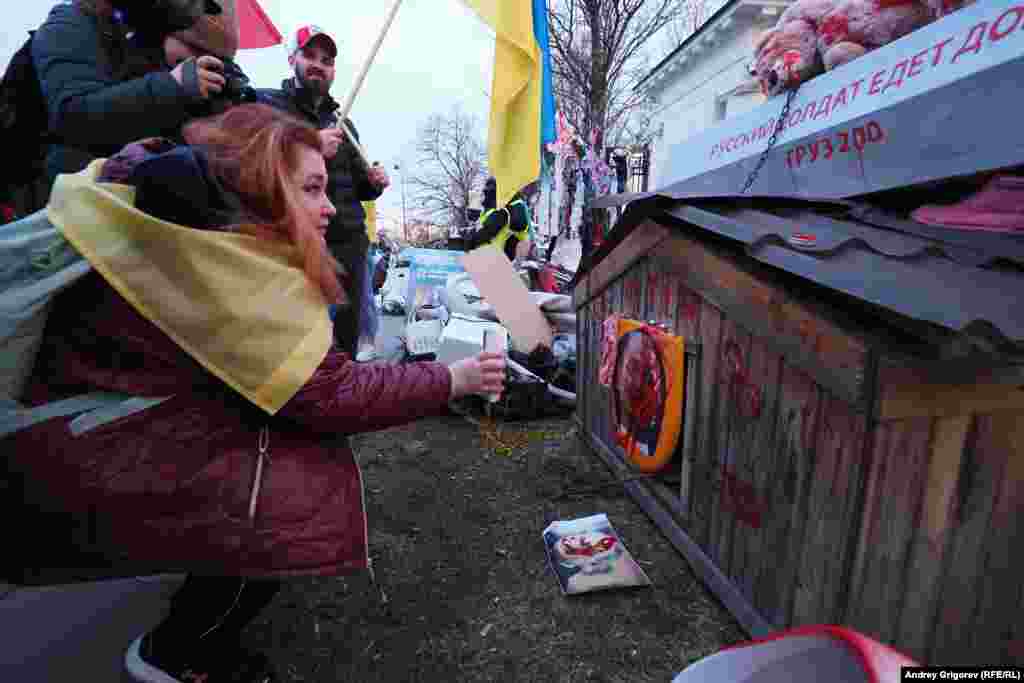 Наибольший фурор вызвало появление у забора посольства собачьей конуры и гроба с надписью "Русский солдат едет домой. Груз 200".