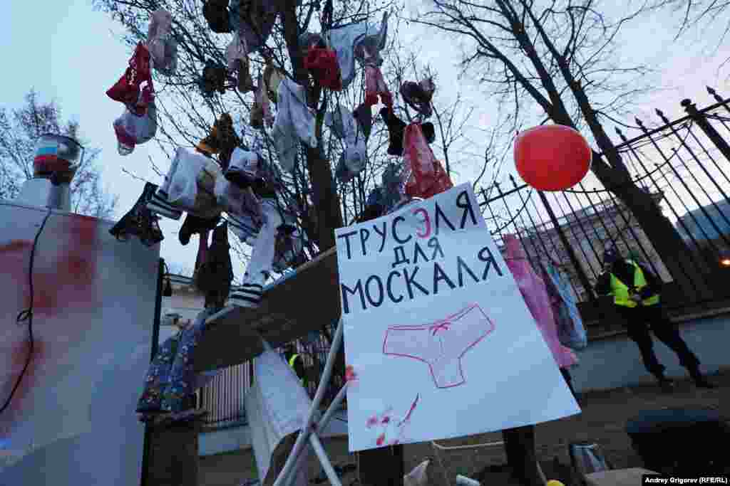Горы хлама выросли в среду вечером, 13 апреля, перед воротами посольства РФ в Варшаве. Протестующие, среди которых были украинцы, поляки, беларусы, татары и русские, принесли ко входу в посольство на улице Бельведерской бытовую технику, ковры, обувь, игрушки и нижнее белье.