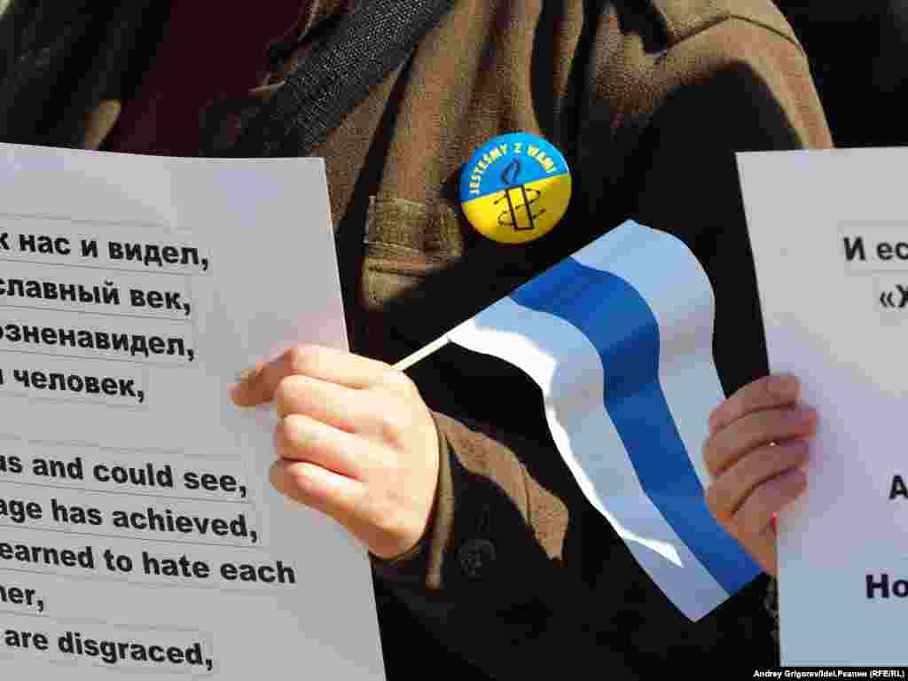Россияне вышли с плакатами, на которых были напечатаны на русском и английском строки из стихотворения Дмитрия Мережковского "Христос воскрес":