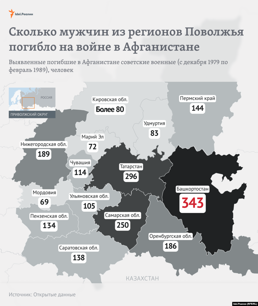 По подсчетам "Idel.Реалии" на 24 марта 2023 года, Башкортостан по числу погибших снова на первом месте — 551 человек, Следом идут Пермский край (414) и Самарская область (394).