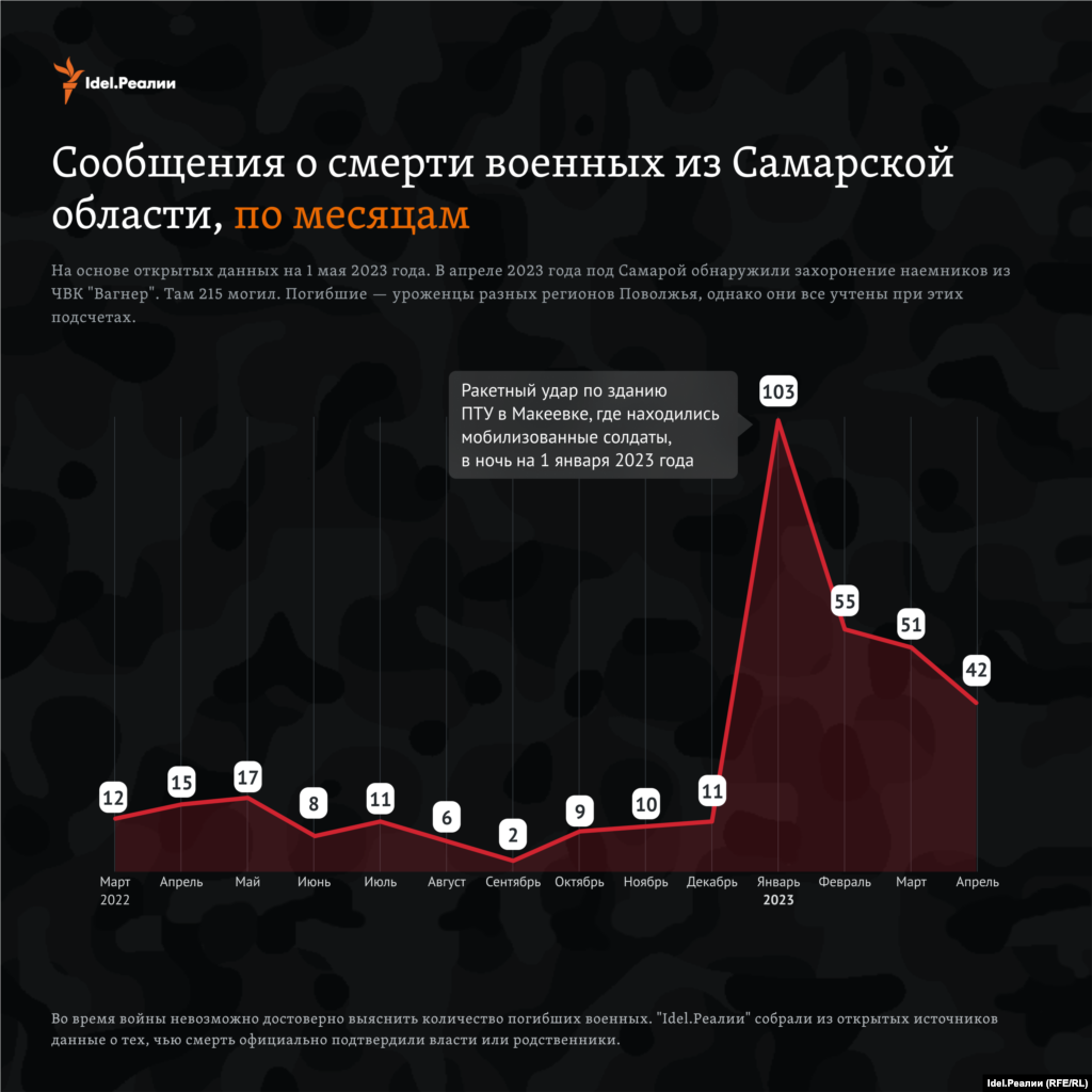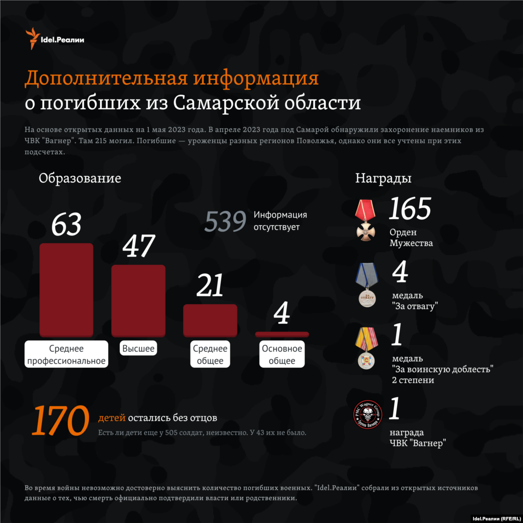 В апреле 2023 года под Самарой обнаружили захоронение наемников из ЧВК "Вагнер". Там 215 могил. Погибшие — уроженцы разных регионов Поволжья, однако они все учтены при этих подсчетах.