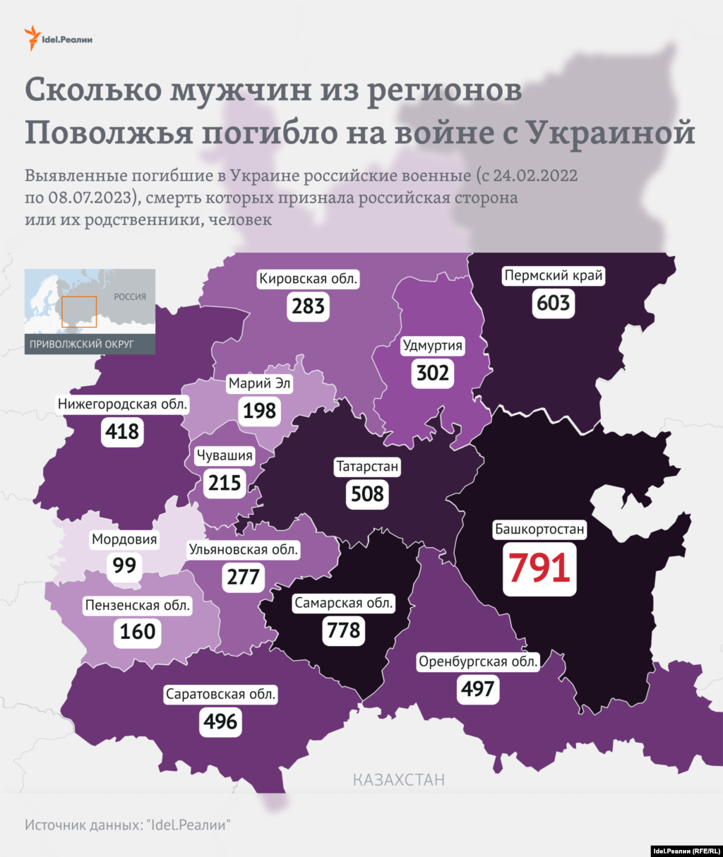 По количеству погибших мужчин на первое месте вышел Башкортостан — 791 человек. На втором месте Самарская область с 778 погибшими с начала войны. Следом идут Пермский край (603), Татарстан (508). Меньше всего выявленных погибших в Мордовии — 99 человек.