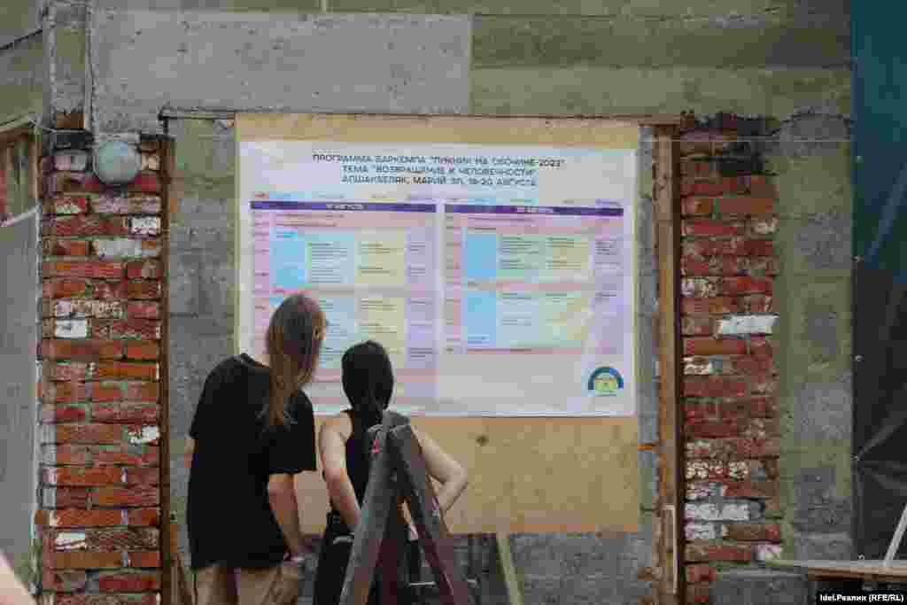На участке семьи Григорьевых, где проходил марийский баркемп, — жилой дом-бочка, баня, блочный сарай, загон для кур, несколько грядок и много свободного места. В березовой роще за баней разместился палаточный городок участников — здесь они провели весь уикенд с пятницы по воскресенье. У строящегося сарая — сцена (откуда делались объявления о всех важных событиях и где выступали музыканты). И три палатки для собственно "Пикника на обочине" как площадки для выступлений активистов, экспертов и дискуссий. Тема 2023 года, ее инициативная группа обсуждала с весны — "Возвращение к человечности".