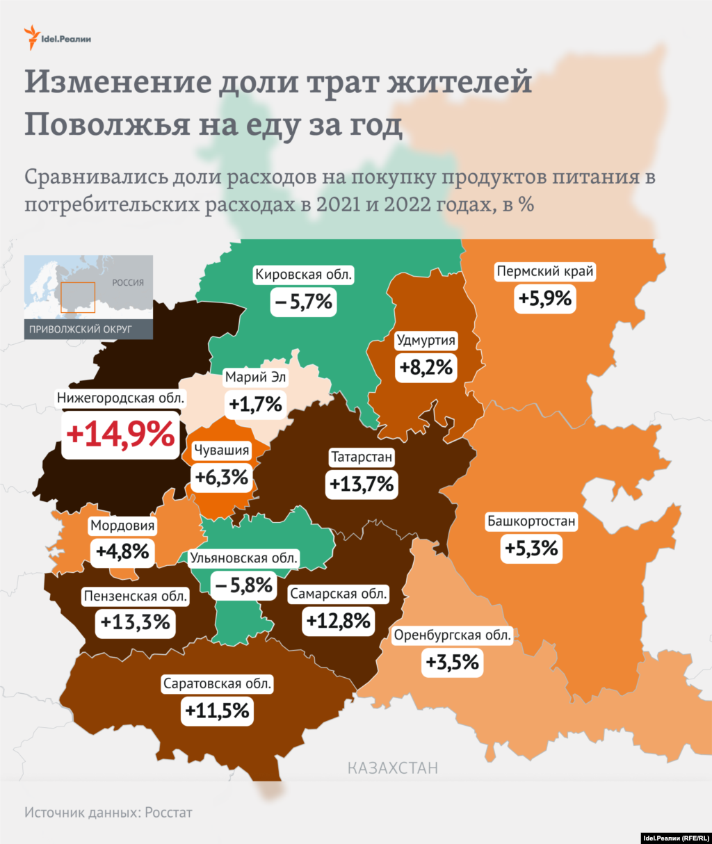 По росту расходов на еду за год на первое место вышла Нижегородская область — на 14,9%. Расходы на еду ощутимо выросли также в Татарстане (на 13,7%) и в Пензенский области (на 13,3%). Меньше стали тратить на продукты питания только в Кировской и Ульяновской областях — на 5,7% и 5,8% соответственно.