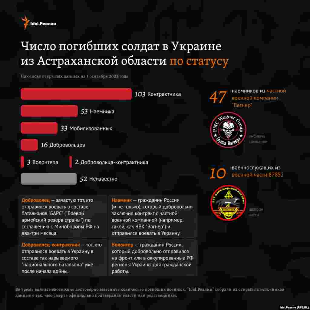 Как минимум 140 уроженцев Астраханской области в возрасте до 35 лет признаны погибшими в Украине с начала войны. Из общего числа погибших 103 человека числились контрактниками — это те, кто находились в составе действующей армии страны на момент начала войны в Украине (24 февраля 2022 года) или подписали официальный контракт с Министерством обороны России уже после ее начала. Они служили в регулярной армии. Еще 53 человека были наемниками (47 из них служили в ЧВК "Вагнер"); 33 — мобилизованными; 16 — добровольцами.
