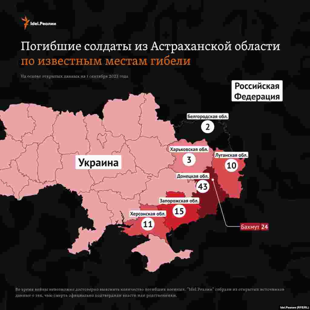 Большинство солдат, согласно нашим данным, погибли в Бахмуте Донецкой области Украины — как минимум 24 человека.