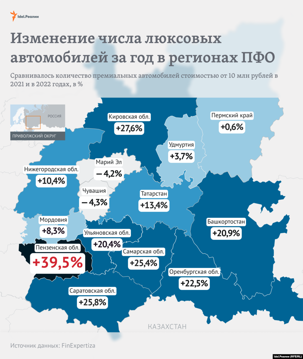 Меньше всего люксовых авто в Мордовии (13), Чувашии (22) и Марий Эл (23).