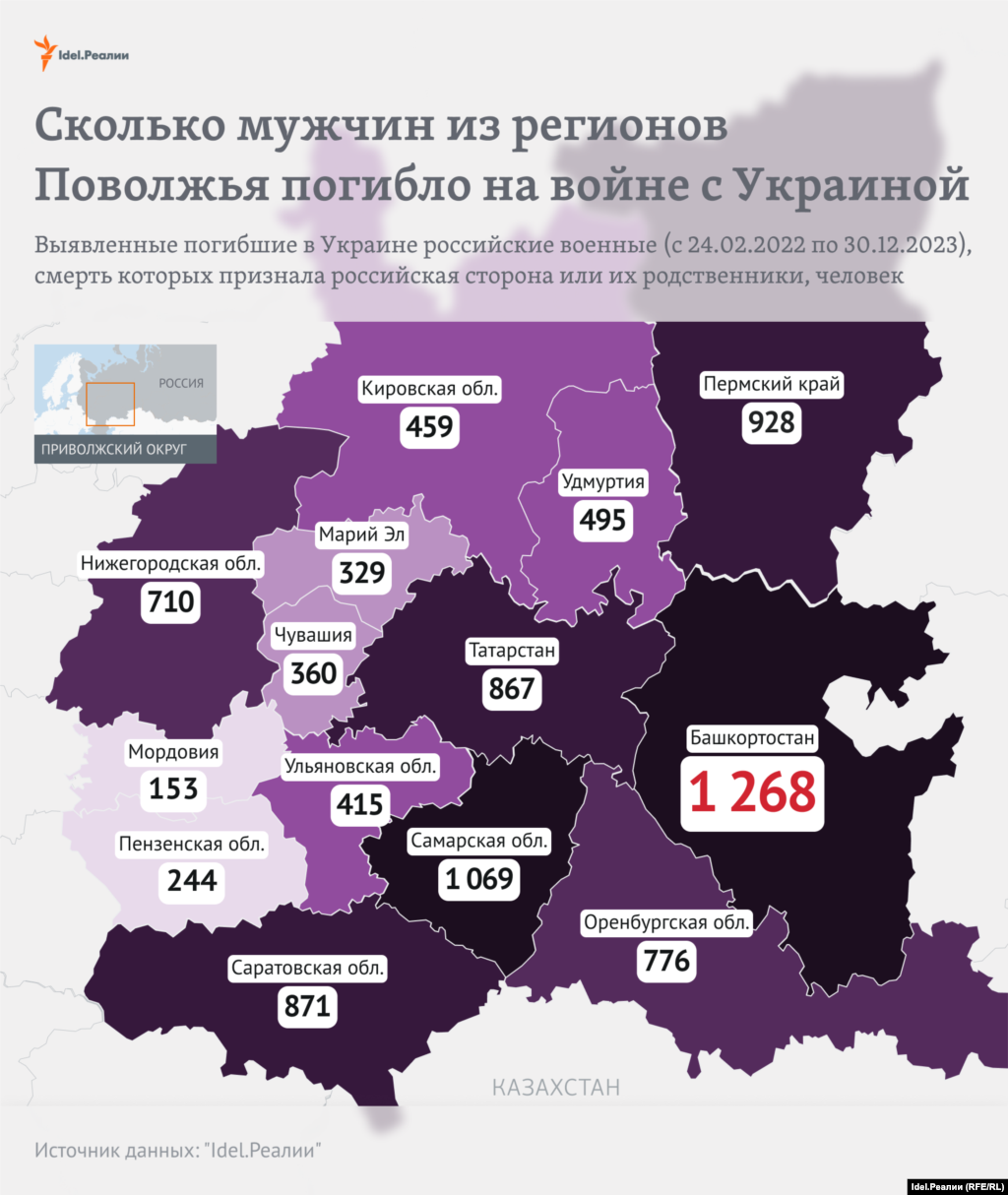 По количеству погибших мужчин на первое место вышел Башкортостан — 1 268 человек. На втором месте Самарская область, где число погибших также перевалило за тысячу — 1 069. Следом идут Пермский край (928), Саратовская область (871). Меньше всего выявленных погибших в Мордовии — 153 человека.