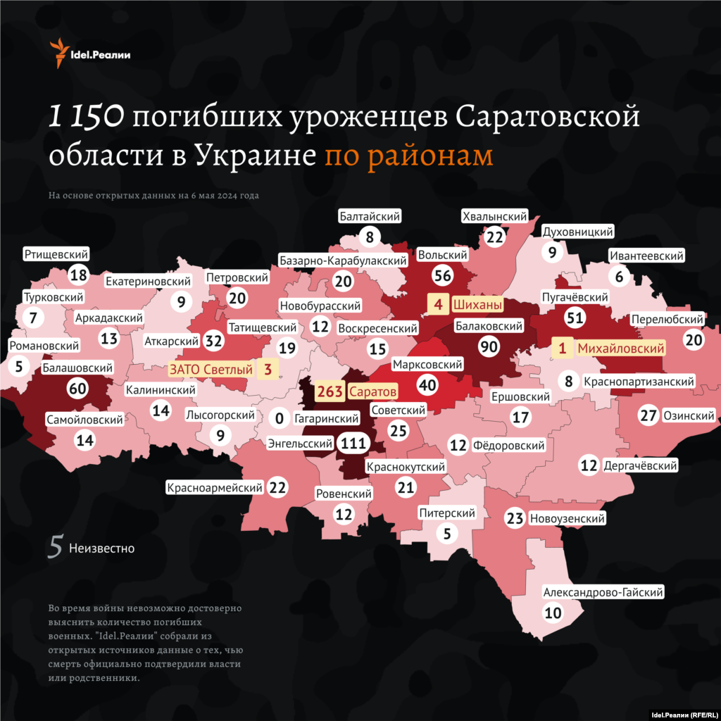 Количество погибших в действительности больше, мы руководствуемся лишь данными из открытых источников. По подсчетам "Idel.Реалии", с начала войны погибли 13 666 уроженцев и жителей Поволжья.