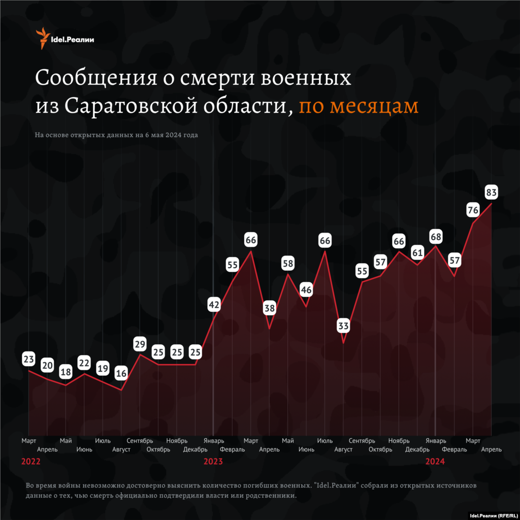 Количество погибших в действительности больше, мы руководствуемся лишь данными из открытых источников. По подсчетам "Idel.Реалии", с начала войны погибли 13 666 уроженцев и жителей Поволжья.