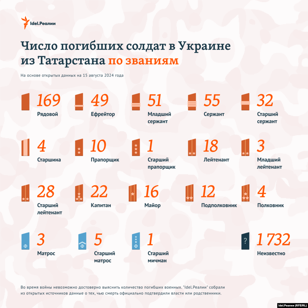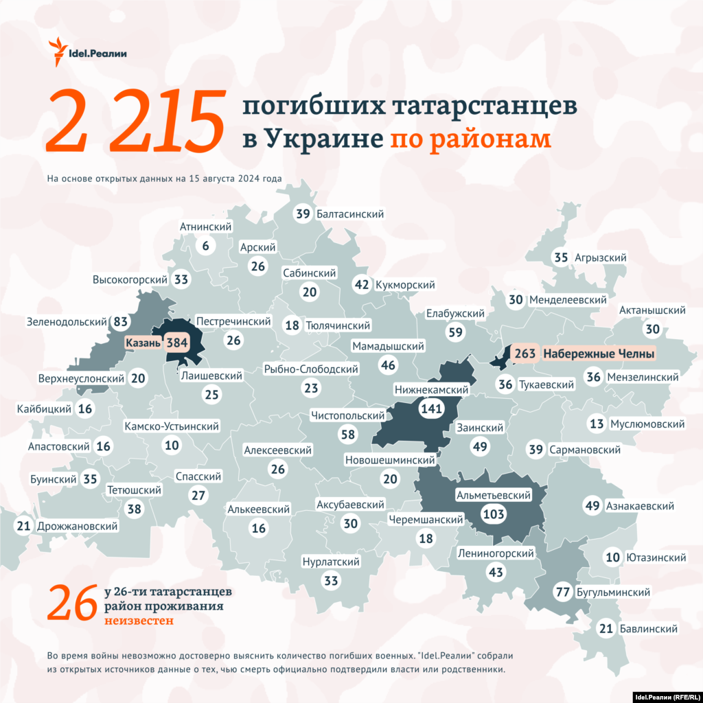 Количество погибших в действительности больше, мы руководствуемся лишь данными из открытых источников. По подсчетам "Idel.Реалии", с начала войны погибли 17 876 уроженцев и жителей Поволжья.