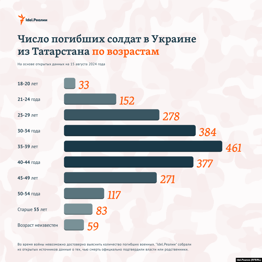 "Idel.Реалии" собрали всю известную на данный момент информацию о погибших на войне уроженцах Татарстана — возраст, звания, районы, образование, дети, медали и др. Всего, по данным на 15 августа 2024 года, погибшими признаны как минимум 2 215 человек из Татарстана.