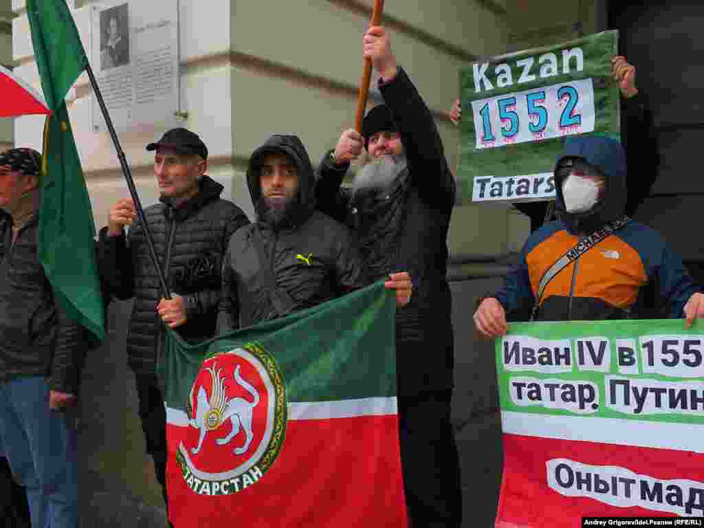 Всего, несмотря на проливной дождь, собралось более тридцати человек, которым Нафис Кашапов раздал плакаты собственного изготовления. Надписи на плакатах были сделаны на разных языках — русском, татарском, украинском, белорусском, польском, английском.