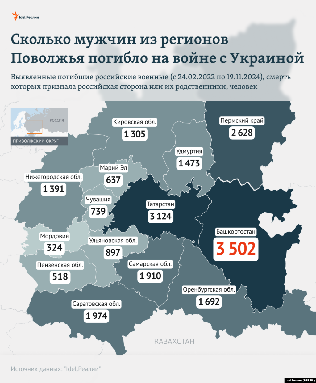 Самое большое количество погибших — из Башкортостана (3 502 человека). На втором месте — Татарстан (3 124 человека). На третьем — Пермский край (2 628 человек). По количеству погибших мужчин на 100 тысяч мужского населения на первом месте — Кировская область с 365,7 погибших. Следом идут Пермский край — 355,3 чел. на 100 тысяч мужского населения, Удмуртия — 342,7 человека на 100 тысяч и Марий Эл — 320,3.