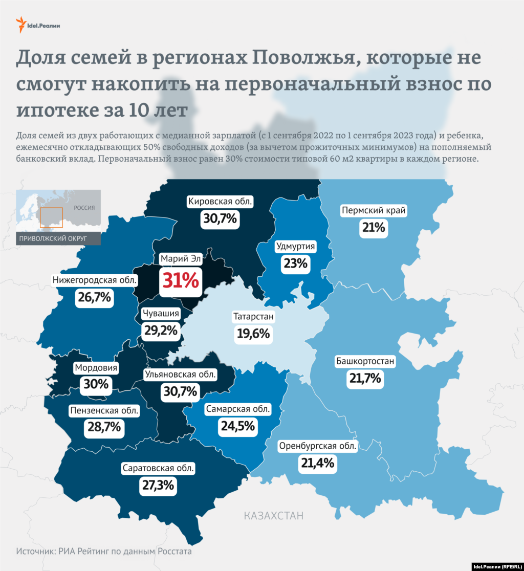 31% марийских семей не смогут накопить на первоначальный взнос на ипотеку за 10 лет. По этому показателю республика заняла первое место в ПФО. Следом по доле таких семей идут Ульяновская и Кировская области (по 30,7%).