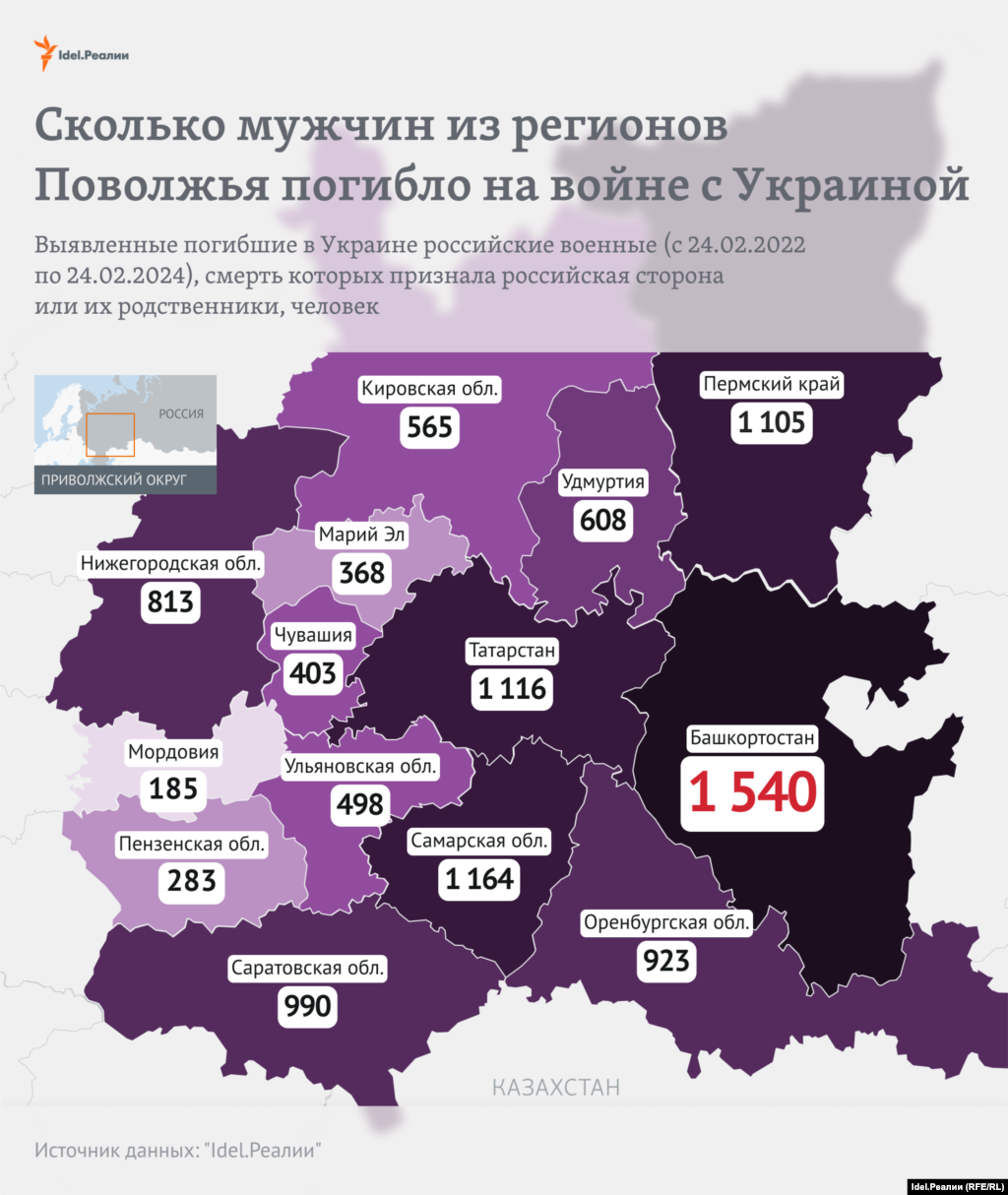 Согласно подсчетам "Idel.Реалии", с начала полномасштабного вторжения России в Украину как минимум 10 974 человека из республик и областей Поволжья погибли на войне в Украине с 24 февраля 2022 года. Их смерть так или иначе признала российская сторона.